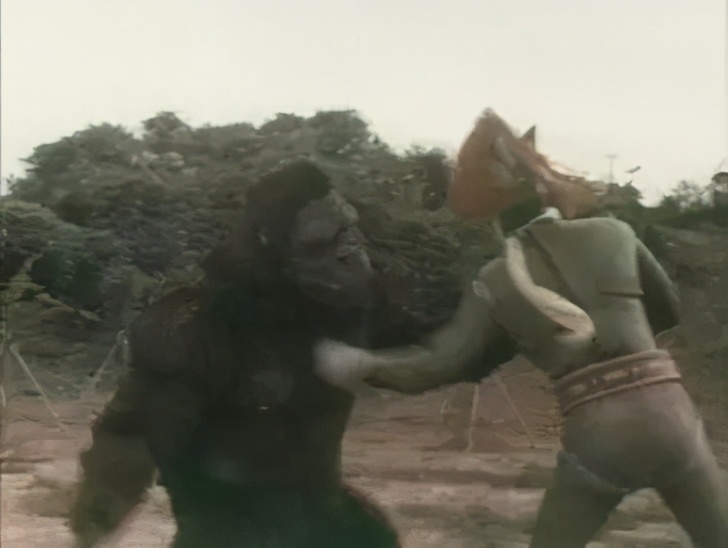 后来只是在《去吧!绿超人》(下图)等相关特摄片中使用过当时金刚的龙套之外(只不过名字变成了“大猩猩”),东宝金刚再也没有出现在大银幕上,哪怕90年代为了在哥斯拉40周年和《金刚大战哥斯拉》30周年等相关活动中,东宝也依然没有使用“金刚”的权力。