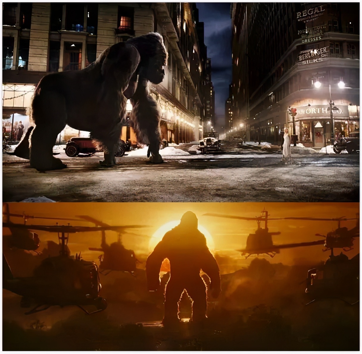除此之外,1976年版的金刚要比原版显得更加“类人化”一些,主要体现在其行为举止上,比如结尾在世贸大厦上抓飞机那段,跟小孩玩玩具一样。