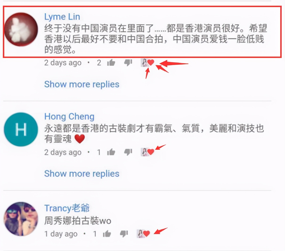 如果,这还只是单纯的没礼貌,那么点赞辱骂内地演员的评论,就很明显是歧视大陆了,而且似乎还带有一些不好的倾向。