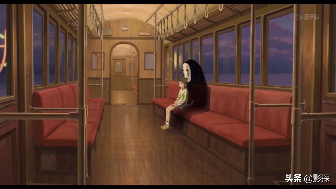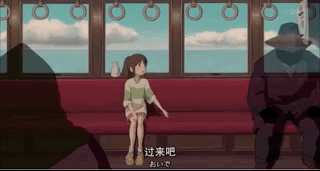 前往沼之地的列车上,千寻坐在座位上,无脸男胆怯的不敢坐在她身边,便一直站着。