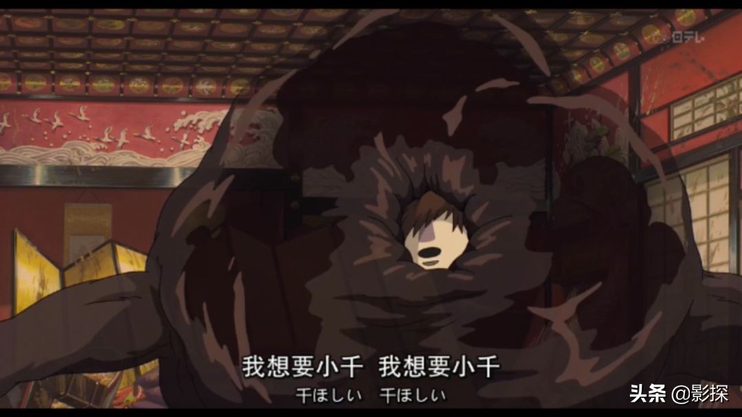 他暴饮暴食、疯魔畸变,在油屋里染了恶,看到千寻却依旧是怯生生讨好的样子。