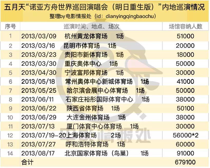 理论而言,买票看演唱会的歌迷都是演唱会电影的潜在观众,从《5月天诺亚方舟》背后的“诺亚方舟世界巡回演唱会(明日重生版)”来看,假定每场座无虚席,14场内地巡演也就意味着覆盖了超 62万的歌迷,按照当时影片39.9的平均票价算,影片预计能回收大概2474万,与最终真实的2084.8万可以说并无太大落差。