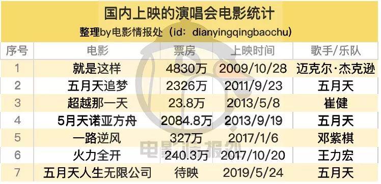 再加上即将上映的《五月天人生无限公司》,从2009到2019,10年间,中国电影市场也就仅有这7部演唱会电影的存在,真正“中国制造”的演唱会电影仅有6部。而在目前已经上映的演唱会电影中,除了五月天,便再无过千万的存在,这背后,究竟是五月天晋升票房担当,还是演唱会电影本身红利已逝呢?