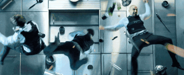 被磁力吸得站不稳,被乱飞的刀叉刺得血浆飞溅,滑稽与暴力并存,相当有创意的动作戏了。