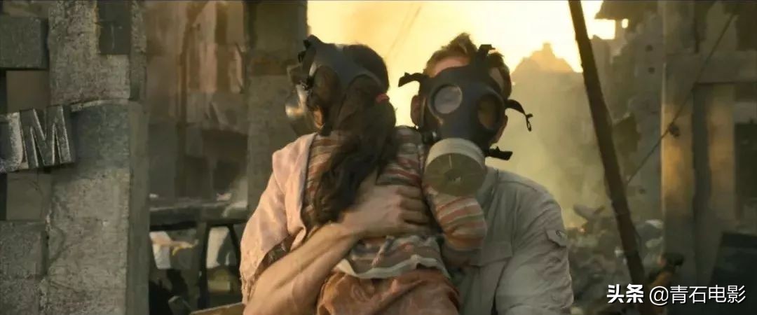 战斗机毒气轰炸,硝烟弥漫,难民四散,废墟之上黑烟蔽日。