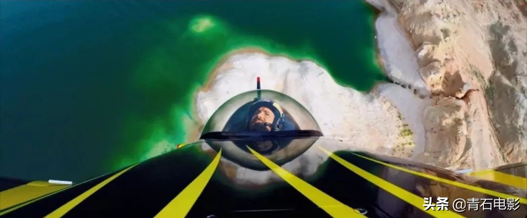 贴水面而来的飞机冲天而上,在广袤砂石湖泊间留下烟雾轨迹,第一视角和第三视角转换。