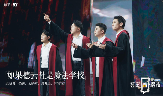晚会还根据“假如霍格沃兹的校长是郭德纲会怎样?”设计了德云社德云社“云鹤九霄”四兄弟化身笑将英雄打败黑魔法的《如果德云社是魔法学校》相声;“华语歌坛有哪些被低估或被埋没的歌手?”请到两次问鼎格莱美大奖的音乐大师吴彤与欧阳娜娜演奏《彤笙彤语》;“什么东西能让你在古代混得如鱼得水?”让喜剧人文松穿越古今解读历史冷知识;还有引发打工人强烈共鸣的“知乎前实习生”李雪琴的《职场黑话指南》... ...
