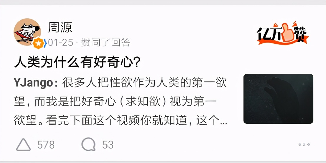 好奇心是人类提问求索,进步的最根本动力,也是知乎社区能够成立的起因。
