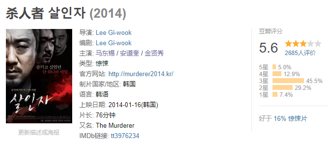 影片于2014年上映,豆瓣评分只有5.6分,主演马东锡、安道奎、金贤秀等。