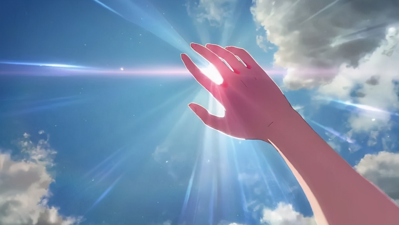 帆高第一次因阳菜的能力看见太阳,手掌通透,遮着白日光。这一刻的光,是温润且深情的。
