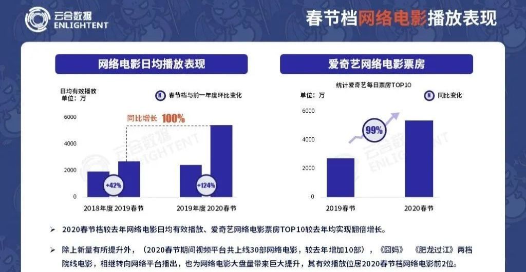 根据云合数据显示,2020年春节期间视频平台共上线30部网络电影,较去年增加10部;春节档网络电影日均有效播放、爱奇艺网络电影票房top0较去年都呈现翻倍增长。