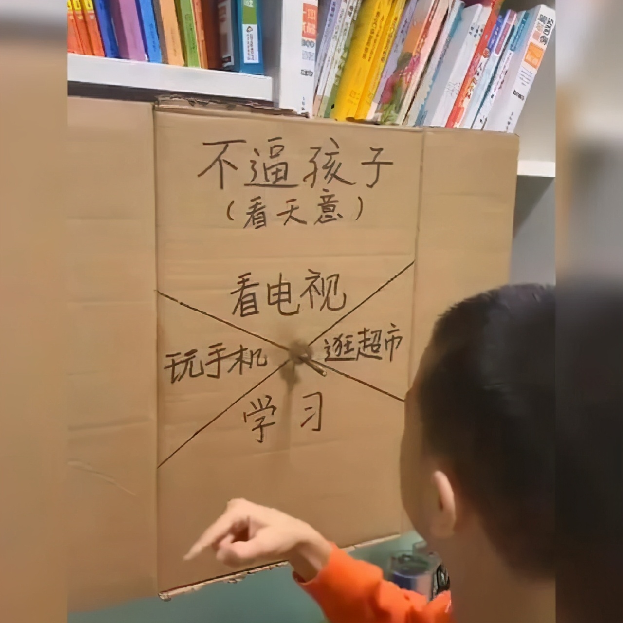 所以爸爸妈妈用一个纸箱的厚纸板做了一个转盘,给轮盘起名“不逼孩子,看天意”。