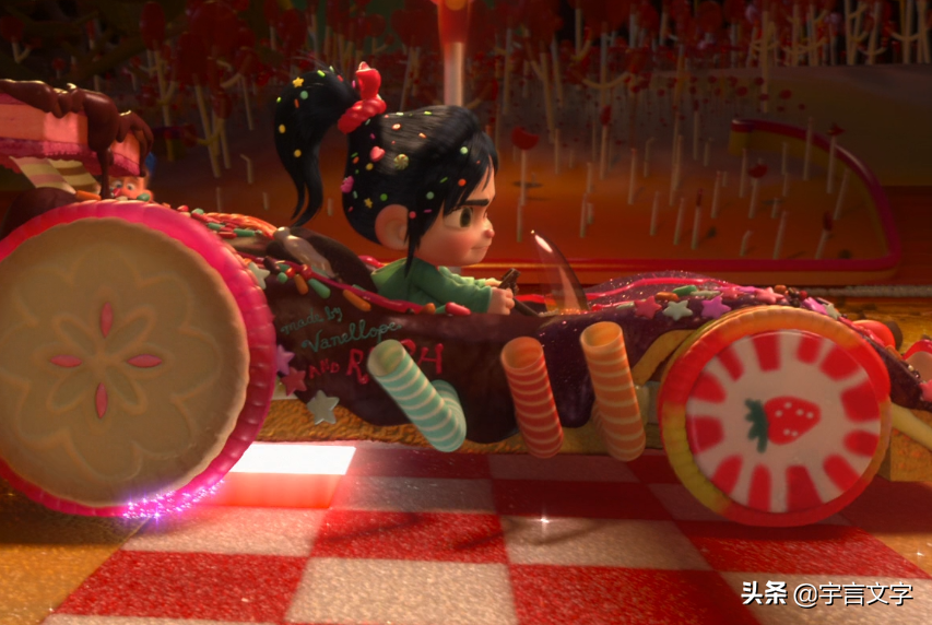 他的奖牌被自己为了参赛拿走,她为了补偿,用糖果另做了一块,上面刻着“you are my hero(你是我的英雄)”。她才是真正的鉴别之镜,照出了拉尔夫坏人角色下温暖、善良的一面。这块糖果挂饰,才是真正的“好人金牌”。