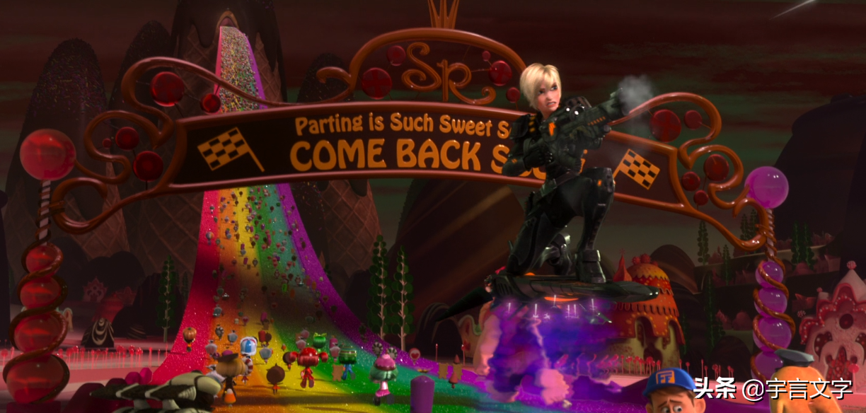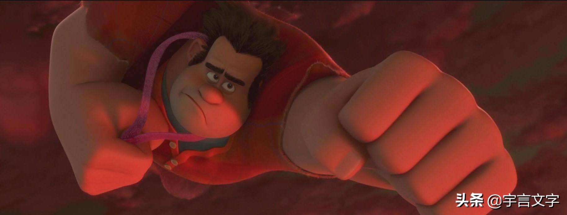 影片最后,拉尔夫凭借一人之力,撕开黑夜中的光亮,让破碎的糖果国度恢复生机。从浓黑又到粉色的世界,强烈的视觉冲击下,震撼着观众的情感,也让拉尔夫“硬汉柔情”的形象深入人心。