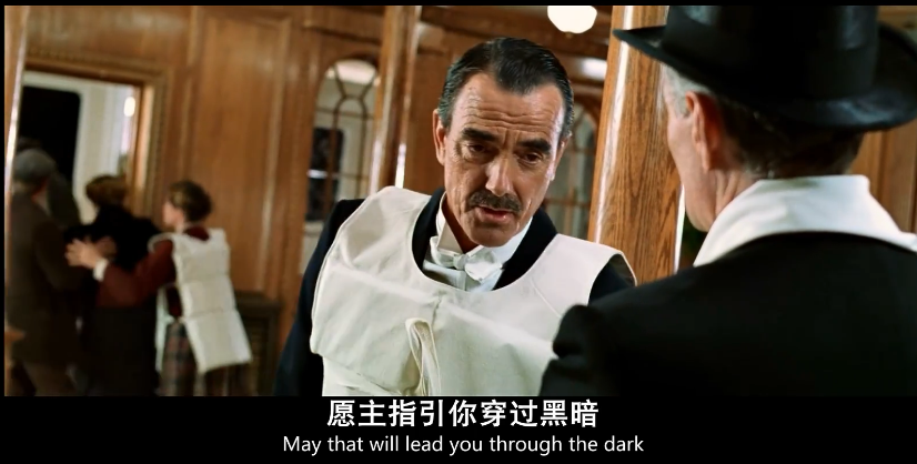影片中他曾在泰坦尼克号沉没前带着一群绝望的乘客进行祷告,场面非常感人,也非常悲情。
