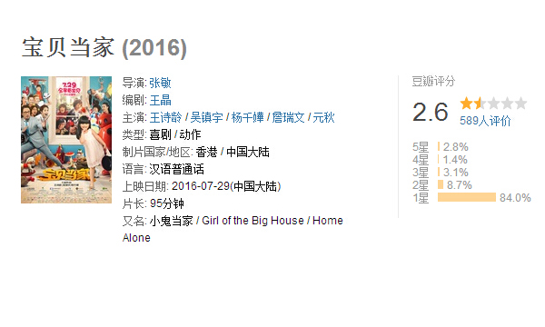 3.《宝贝当家》(豆瓣评分2.8)"王诗龄小朋友虽然可爱,但能不能回学校好好学习啊,演技真的一般般哎,还有制片方别以为在暑假档放这种家和万事兴的片子就能圈钱,就算要圈钱也不能这样粗制滥造吧。还有吴镇宇,一身好演技啊,来大陆接这种烂片,真不知道该说什么。