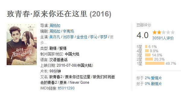 6.《致青春·原来你还在这里》(豆瓣评分4.0,你敢信,这分数在国产青春爱情片中分数算高)