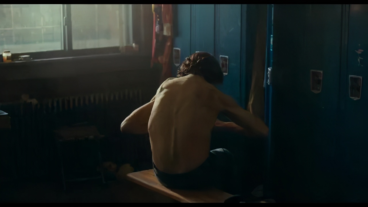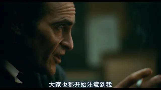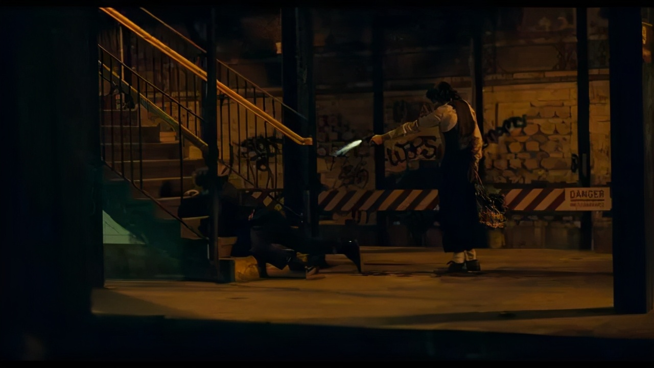 孤独瘦弱的亚瑟根本无法抗拒。三个西装革履的人击败了躺在地上的亚瑟,享受着被欺凌的感觉。这里的镜头光影俱全.