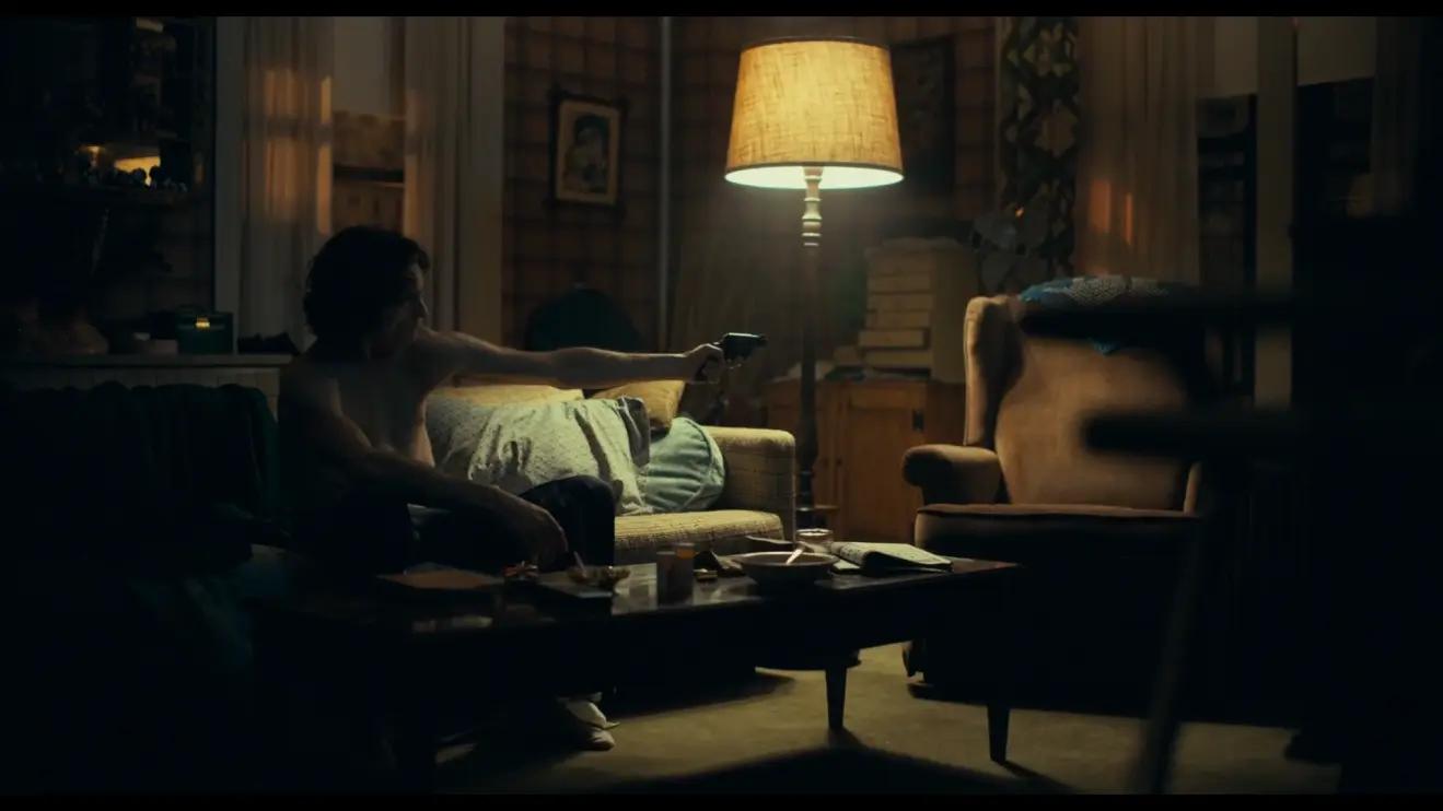 母亲睡着后,亚瑟独自一人坐在客厅里看电视,摆弄着同事给他的手枪。