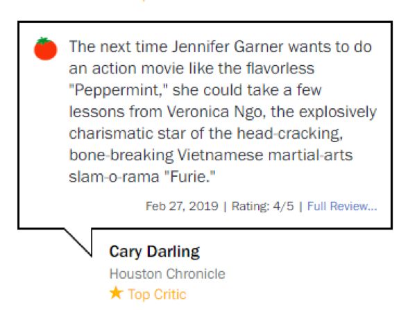 「詹妮弗·加纳如果再拍《薄荷》这种动作片,应该好好学一学吴青芸的这部《二凤》,通过演员强烈的个人魅力和动真格的越南功夫给观众带来强烈的视听盛宴。」——《休斯敦纪事报》