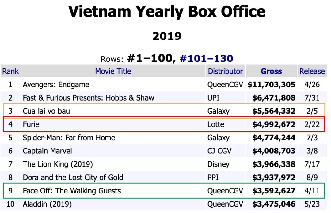但越南电影很争气,本土片仅输给了《复联4》《速度与激情:特别行动》,却干翻了一票好莱坞大片,《蜘蛛侠:英雄远征》《惊奇队长》《狮子王》在越南纷纷败下阵来。