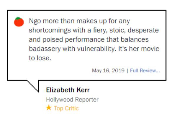 「吴青芸的角色刚柔并济,这种凶狠、坚忍、绝望、镇定的性格出演极大程度上弥补了影片其他方面的不足。」——《好莱坞报道者》