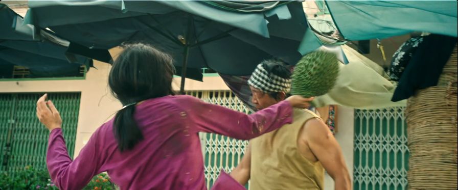 比如菜市场的一场戏,我们能够看到菜刀、榴莲,乃至于水中的树藤,都能被主角化为己用,成为致命的武器。