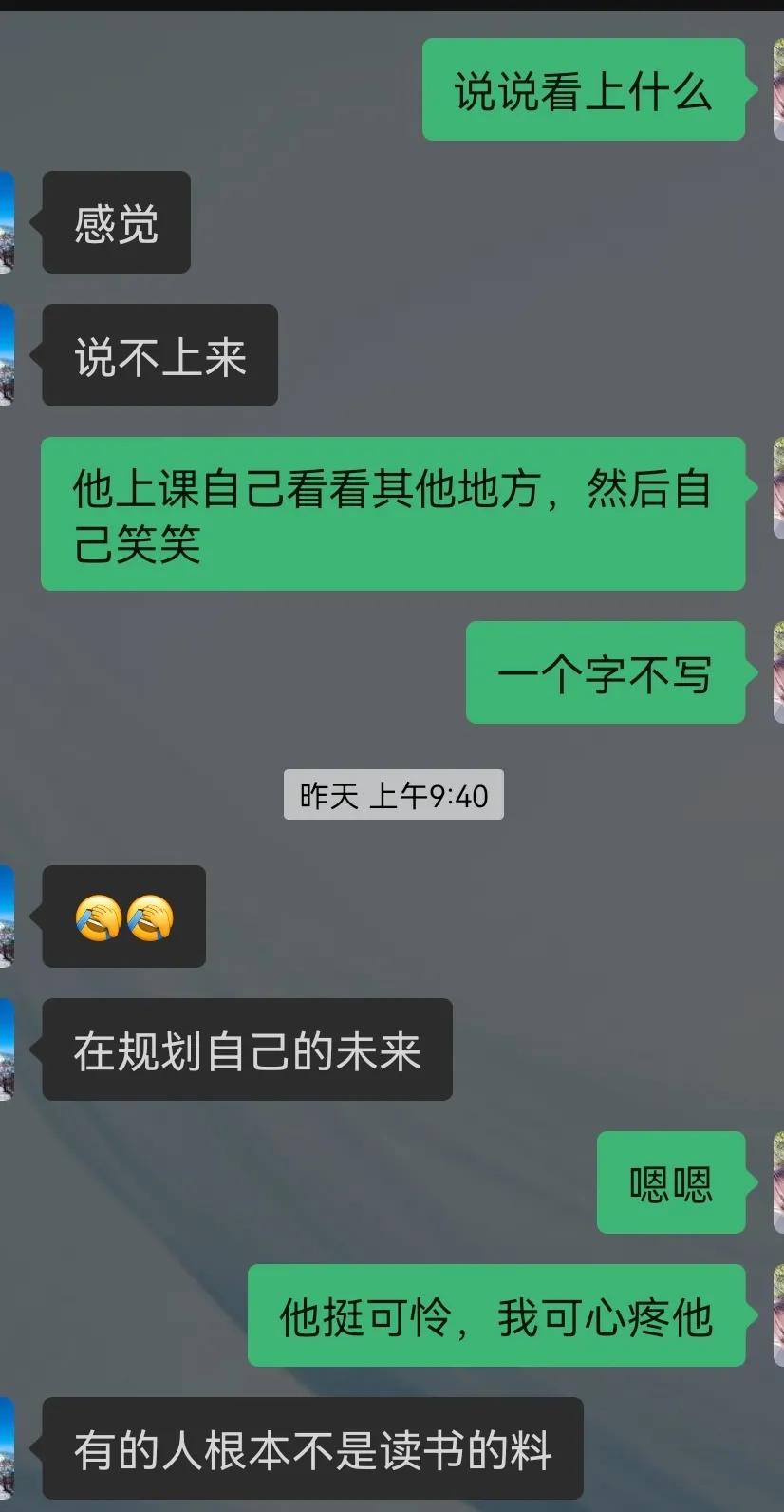 刚来这个学校的时候,我是相信每一个孩子都会改变,每一个孩子都可以有自己的发光点,但是随着环境的影响,我会有些动摇,我甚至会受到一些领导的影响甚至想放弃那些真的什么都不学的孩子,我甚至觉得我在这里仅仅一个学期,我能做什么吗?我真的能帮助他们吗?