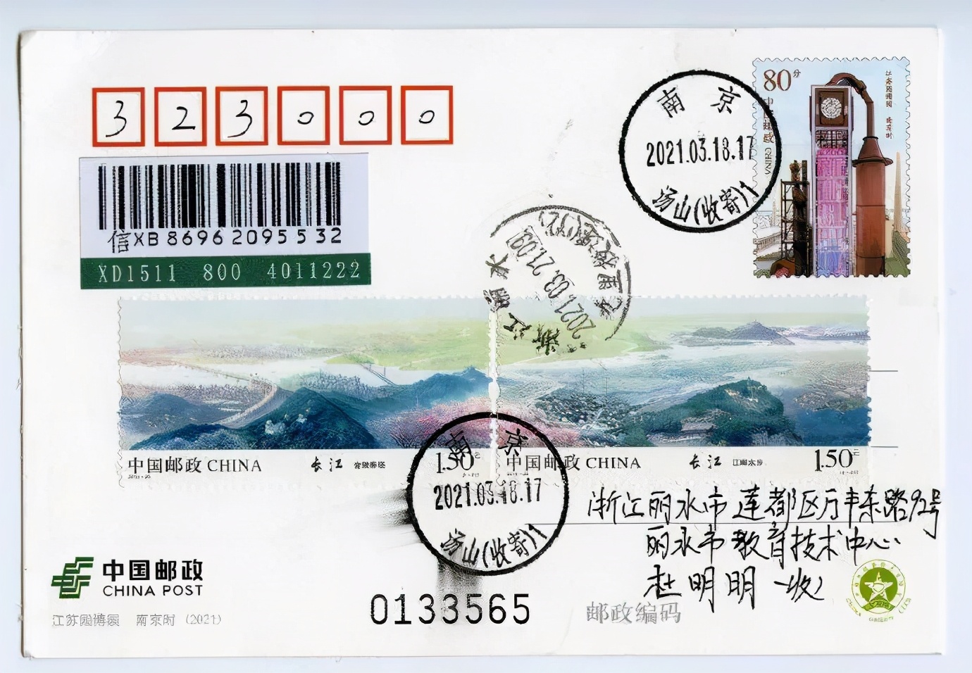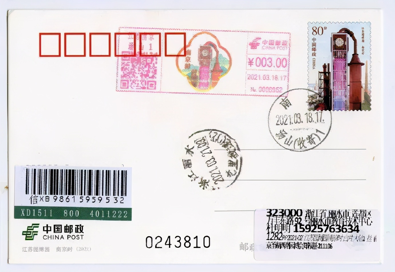最近我在仔细欣赏《江苏园博园·南京时》普通邮资明信片时,发现一枚片上盖“南京/2021.03.18.17/汤山(收寄)1”日戳,日戳式样为钢戳(图1);而另一枚片上盖同样内容的日戳,日戳式样却为储墨戳(图2)。