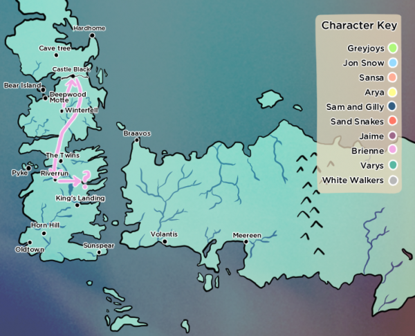 但是,剧外的我们仍旧可以花点时间研究下各个角色的旅程。下面则是来自外媒theverge借助interactive game of thrones map with spoiler control带来的“权力的游戏”旅程路线盘点及其可信度评价: