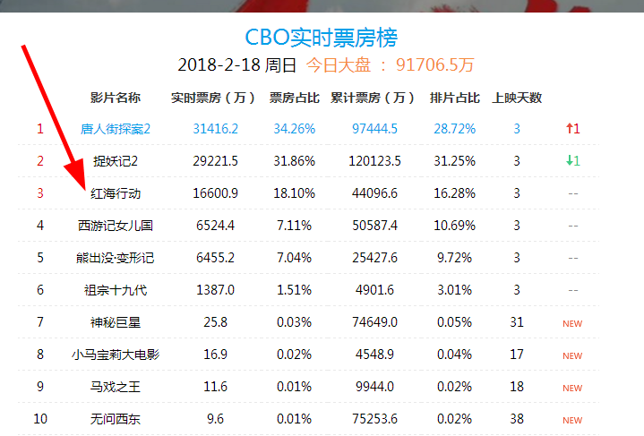 春节票房大战激战正酣,在《捉妖记2》超强大的攻势面前,竟然到了第三天,《唐人街探案2》翻红到了票房第一的位置。《红海行动》紧咬在第三名的位置,和口碑比较差的《西游记女儿国》拉开了近一亿的票房距离