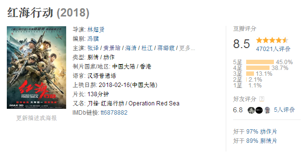 而在口碑评分的豆瓣那边,《红海行动》的得分高达8.5,这个得分如果能坚持到年底,肯定也是年度口碑最好的电影前几名
