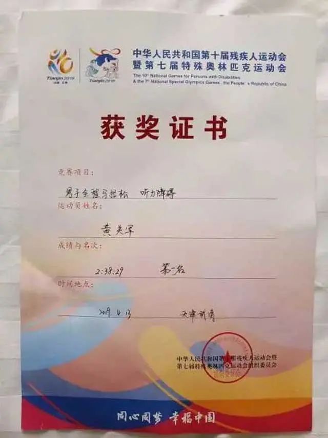 黄关军并非名人,他身上最大的标签是“残运会冠军”,曾经获得全国第十届残运会田径马拉松比赛男子全程马拉松听力障碍组冠军。