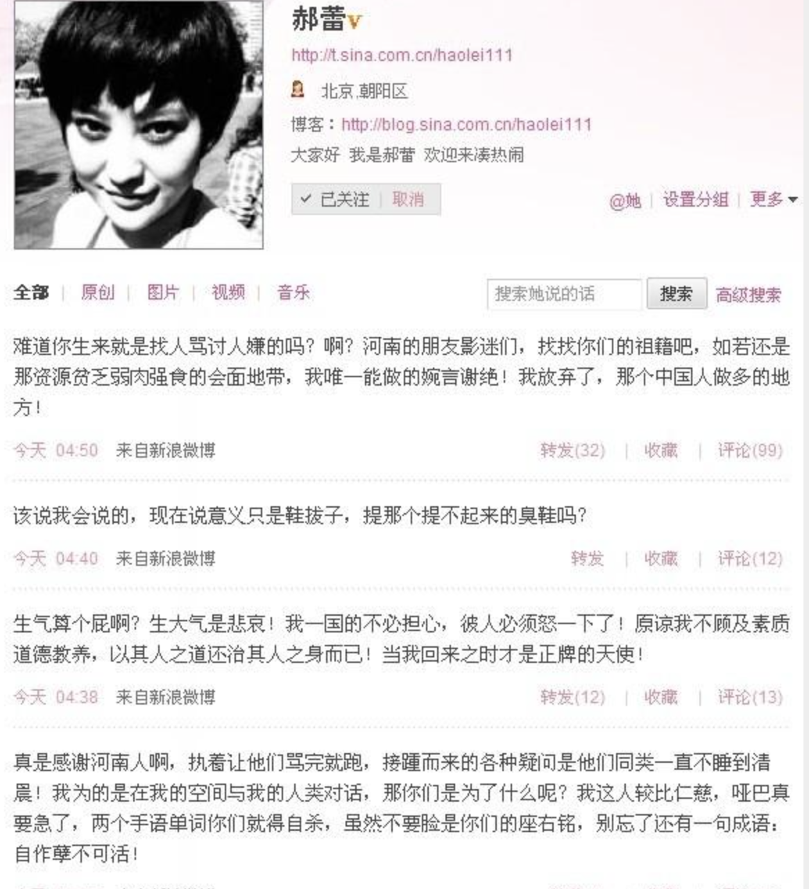 2010年10月26日,郝蕾在其微博上发表30多条博文肆意怒骂河南人,时间持续长达3小时左右,期间还与回复的博友争执,不断爆粗口。