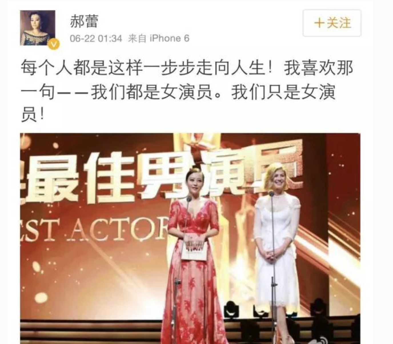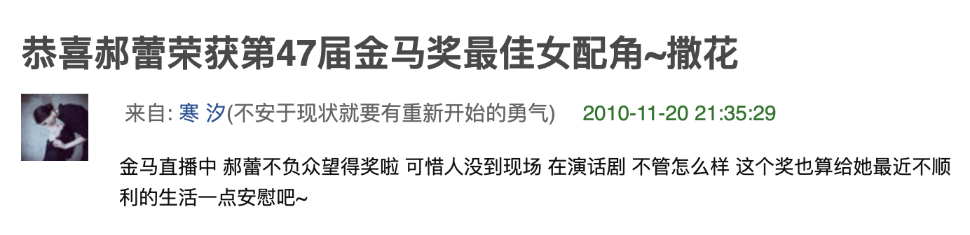 颁奖典礼结束后,郝蕾谢绝了一切采访。只在深夜发了一条微博。