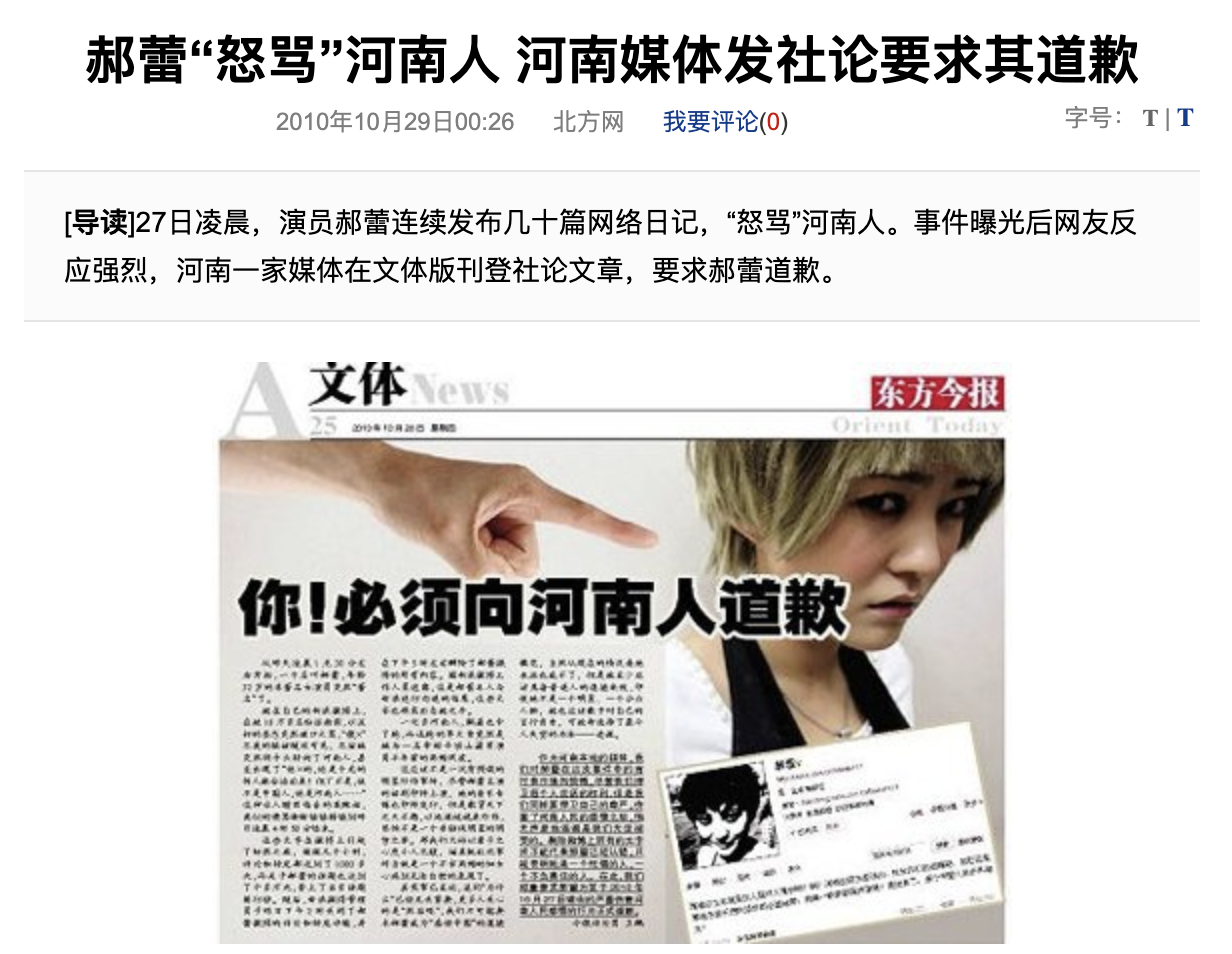 第二天河南当地媒体《东方今报》发文要求郝蕾道歉。