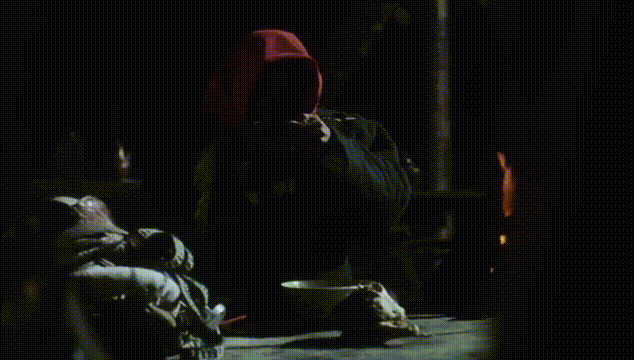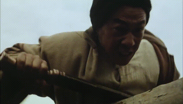 片中寻仇客一刀杀了不少人,只要刀一出鞘,必定见血封喉。跟仇人(孙海英饰演)梦中一战,依旧是诗意满满。暴力美感、血腥镜头,因为充满诗意的剪辑手法让人大呼过瘾。寻仇客刀出鞘,砍向仇人。只见仇人身子微微一闪,接着收刀入鞘,继续啃骨头。而面前的白毛巾上却滴上了不少鲜血,大家都以为仇人必死。镜头一转,才发现中刀的是寻仇客。这样的动作设计,比直白的武功打斗更吊人胃口也更有看头,吸睛十足。