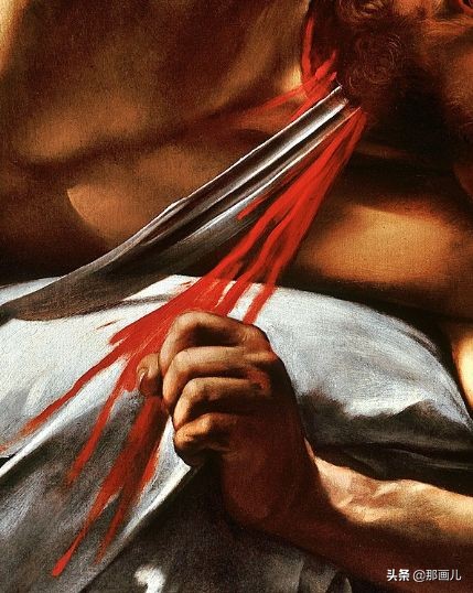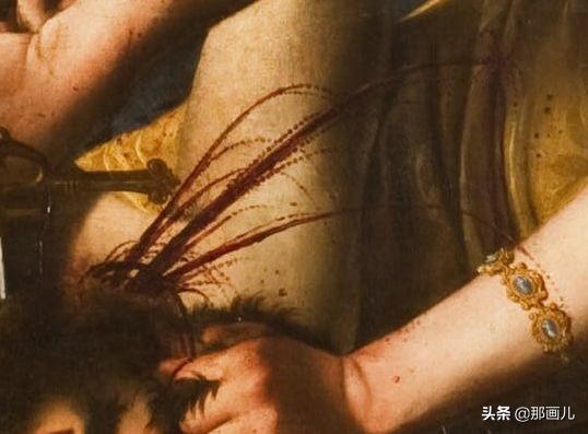 此外值得注意的是血喷出的方式。画儿君看到卡拉瓦乔原作的时候,注意到血液从颜色到形态都显得特别突兀,很有一种画面完成后再添加的感觉。鲜血喷溅的轨迹又粗又直,当然很抓眼球,但却不够真实,倒像是此前历代画家表现喷血时惯用的程式化的手法。