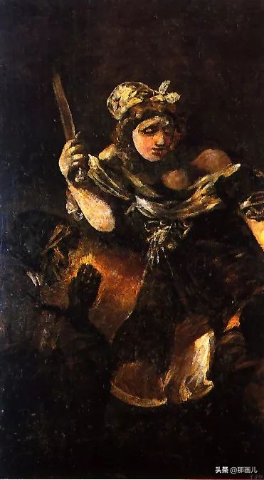 ▲戈雅,1819–23年。风格属于他晚年的黑暗系列,画面主体似乎不是犹滴,而是如同实体般弥漫的黑影,荷罗浮尼几乎不可见。尽管描绘是戏剧性的高潮,但却没有真实的紧张感,因为它是表现主义的,寓言式的。