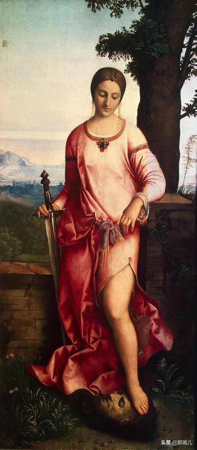 ▲乔尔乔内画作,1505年。犹滴端严得犹如圣母,就连踩踏的动作都毫不着力。