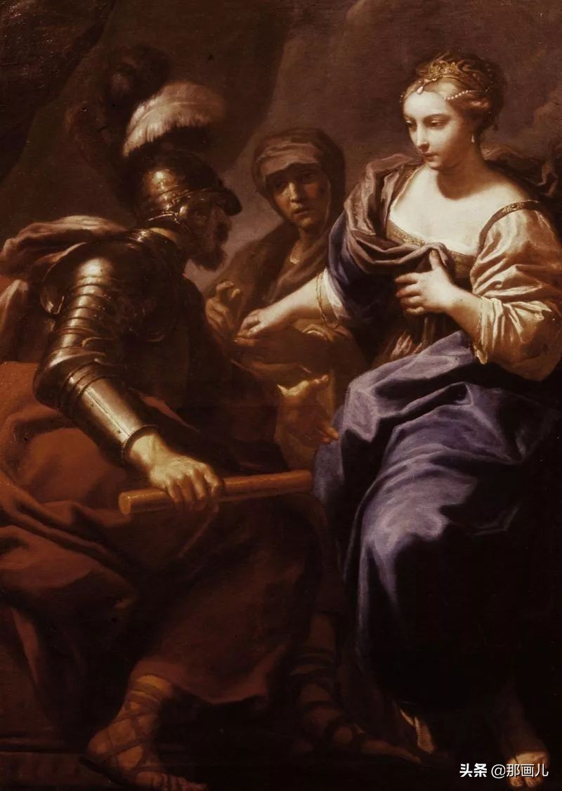 ▲antonio gionima,1720年。犹滴走进荷罗浮尼的军帐,本应是以其艳光四射迷住了对手,但图中却显得腼腆而心事重重。