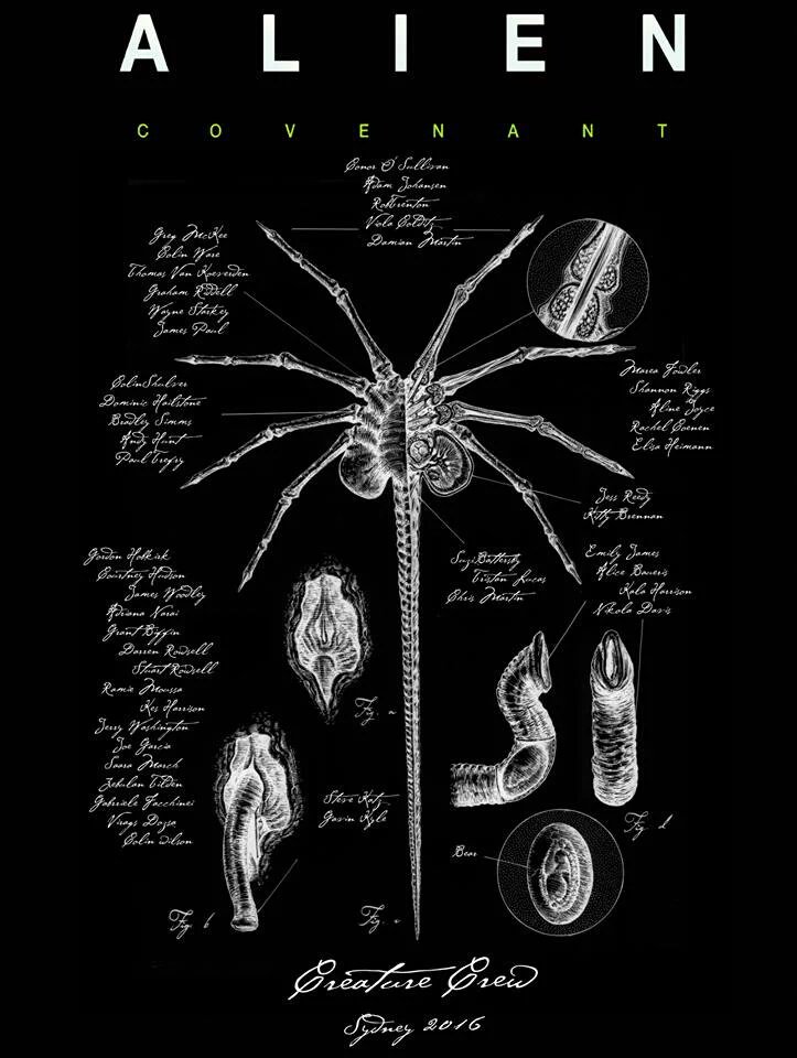 这就是款海报,来自影片生物设计团队,它说明了“抱脸虫”的特性。影片讲述的是《普罗米修斯》故事发生十年之后的事