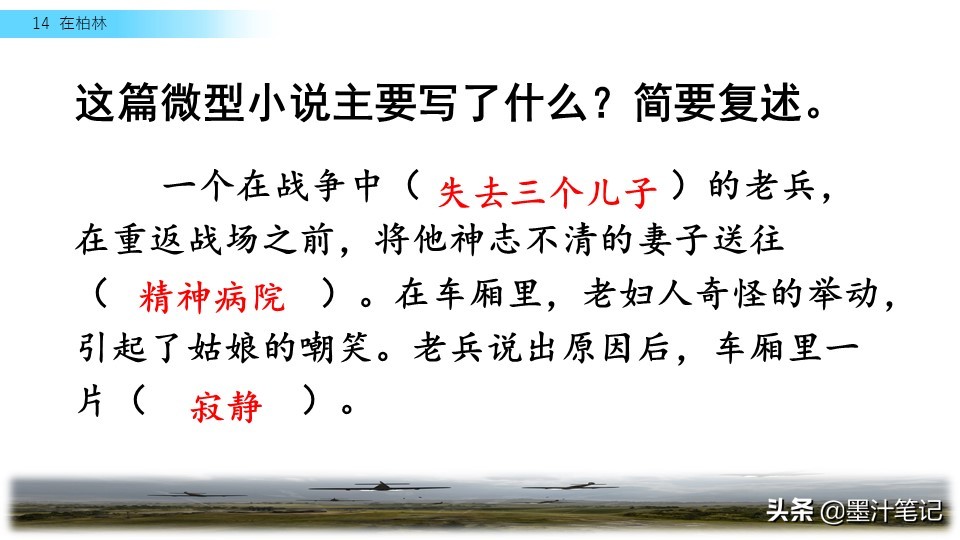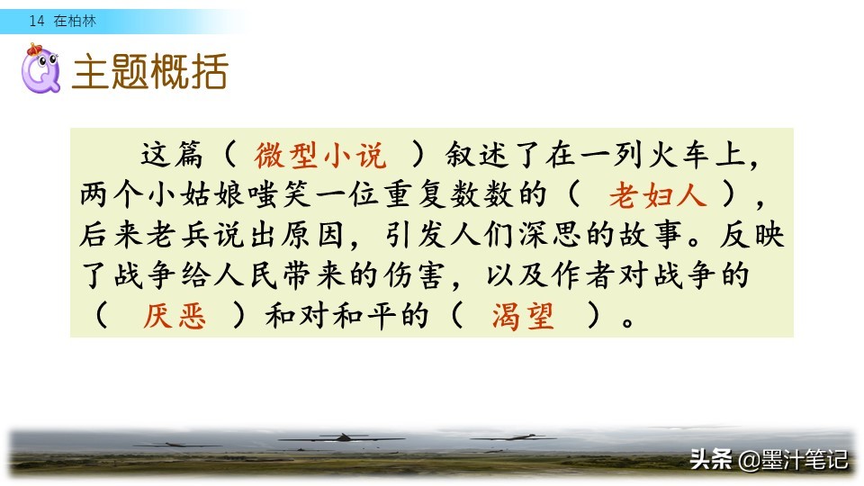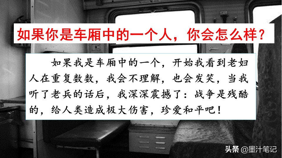 这篇(微型小说)叙述了在一列火车上,两个小姑娘嗤笑一位重复数数的(老妇人),后来老兵说出原因,引发人们深思的故事。反映了战争给人民带来的伤害,以及作者对战争的(厌恶)和对和平的(渴望)。