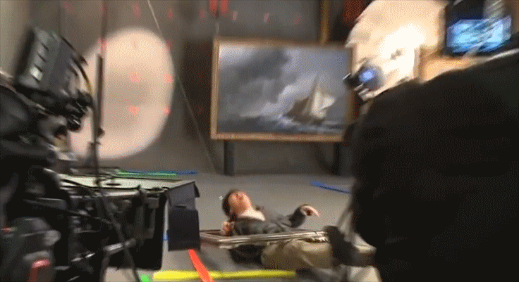 讲的是成龙要穿过一个画框去揣一位演员,试了好几次效果都不太满意,结果有一次刚开始摆动,威亚的钢丝断裂,成龙怀抱着画框应声而落。