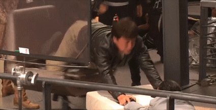 剧组找来高压弹射器让成龙躺在上面模拟坠落的瞬间,一开始为了保护成龙,调试的力度不大,反复试过几次后,成龙为了追求效果,执意将参数调到最大,按下了发射键。