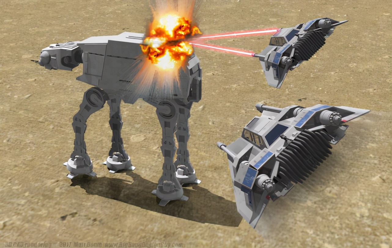 t-47装载有两门前射激光炮,后部是一把发射高强度牵引拖缆的鱼叉枪,由双人操作,一名驾驶员、一名脸朝后的尾炮射手。