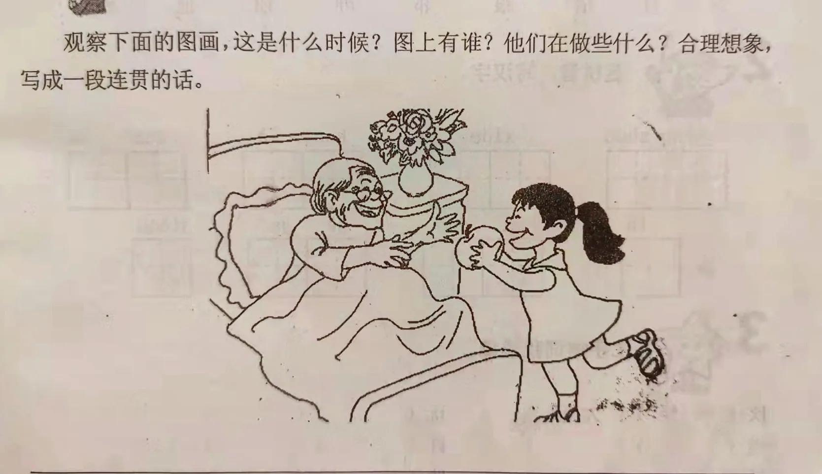 星期天,小红和妈妈一起去看望生病的奶奶。她们提了一篮水果,小红赶紧拿出一个大苹果递到奶奶手里,奶奶笑着说:“小红真是个懂事的好孩子。”他们都开心地笑了。
