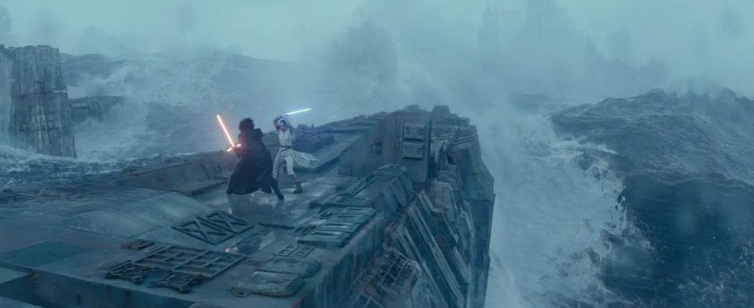 蕾伊和凯洛伦海上的光剑对决,更是让人看了热血沸腾,周围海啸酝酿着角色的情绪和心境,海水拍成浪花挥舞着光剑,让人感受到了对决的能量。