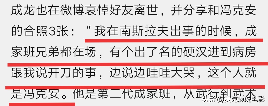 冯克安与成龙之间的情谊,从后者讲的一个小故事之中便可见一斑,当时,成龙在南斯拉夫拍《龙兄虎弟》时头部受伤,冯克安一听到他要开刀的消息便大哭起来,俗话说“不是亲兄弟却胜似亲兄弟”,也许就是这么个解释。