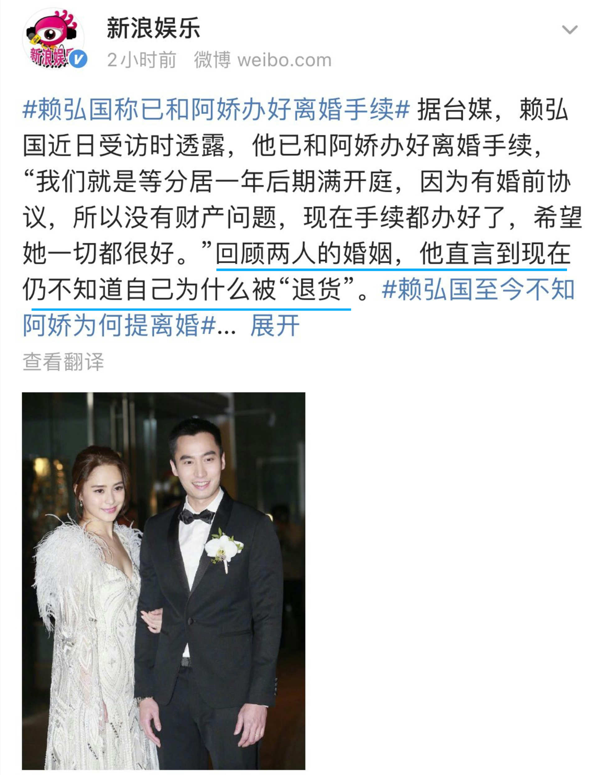 分居一年得以离婚,但前夫赖弘国声称“不知道自己为什么被退货”。